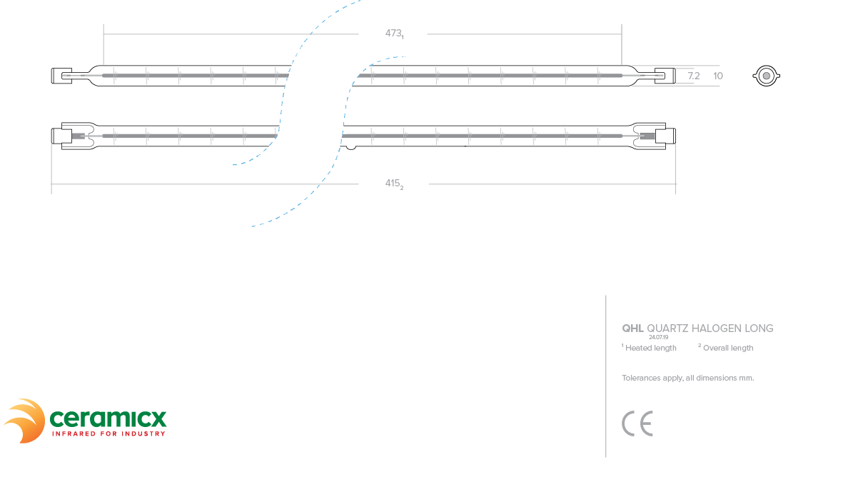 These heaters are filled with halogen gas to allow the supported tungsten filament to reach temperatures as high as 2600°C (4712°F).